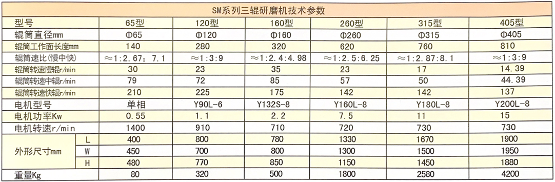 工作原理:是通過水平方向排列的三個輥筒,以不等速運轉以及表面相互擠壓造成的摩擦,使得相鄰軋輥產生強烈剪切力,迫使物料被充分分散、研磨。